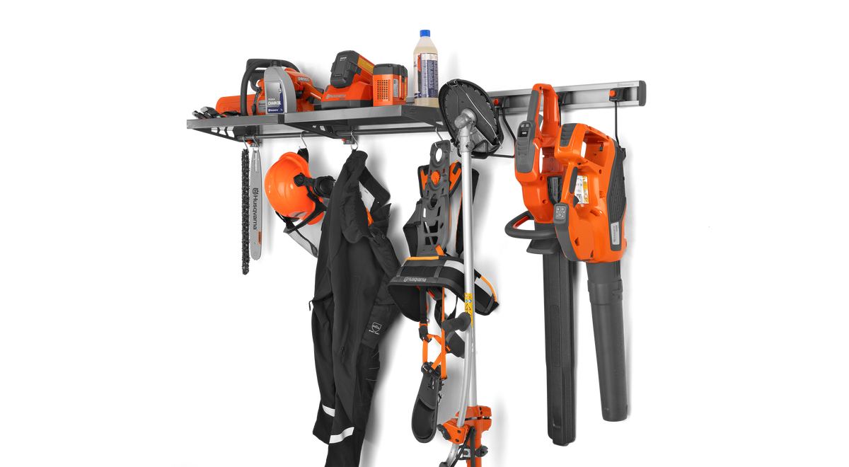 Denna slitstarka motorsågshylla gör det enkelt att organisera och förvara motorsågar, tillbehör, kedjor, mm, på ett och samma ställe. Den passar alla motorsågar på marknaden, kan monteras direkt på väggen och är kompatibel med Husqvarnas förvaringsskena. Hyllan kan även användas som en vanlig förvaringshylla och kommer med ett tråg för uppsamling av smuts, damm och olja för att underlätta rengöring. Förvaringslösningen kan utökas med extra skenor och krokar om du behöver ännu mer förvaringsutrymme.
