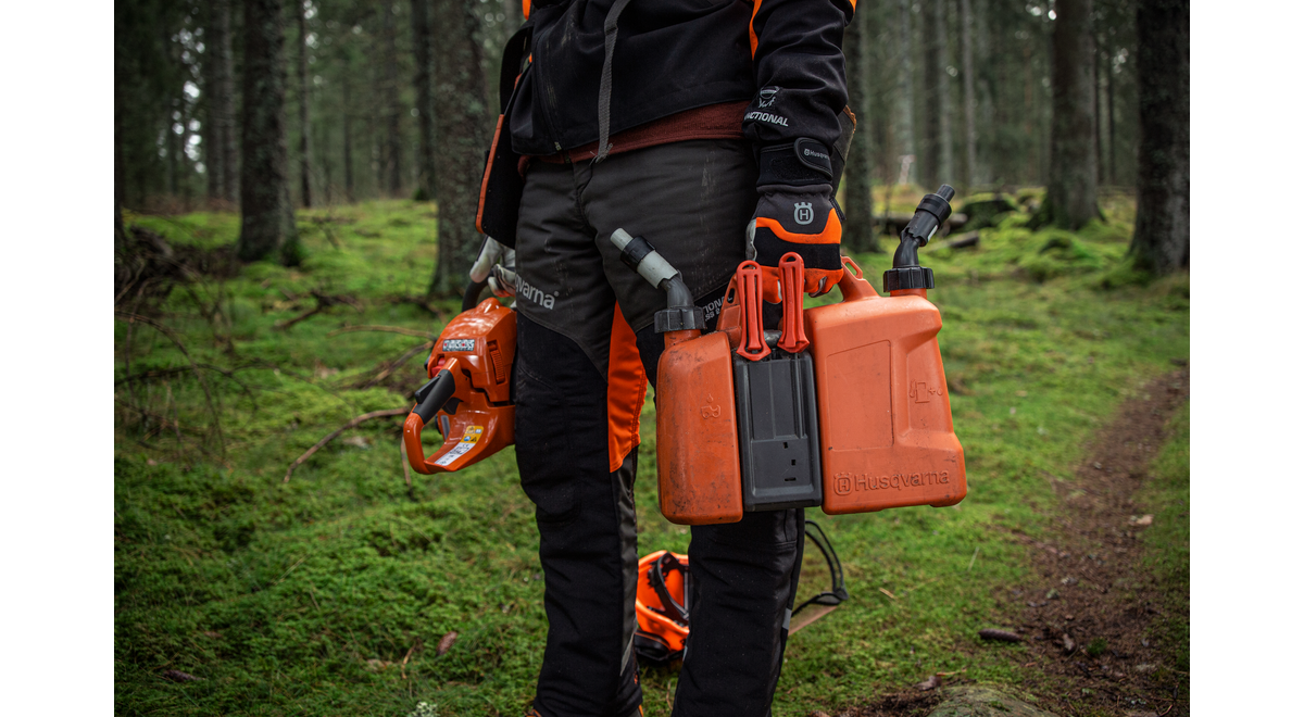 Denna kombidunk ger dig möjlighet att tanka snabbt utan stänk eller spill. Dunken är försedd med en verktygsväska med plats för vanliga verktyg och reservkedjor, fällkilar eller liknande. Volymförhållandet mellan bränsle och kedjeolja har optimerats så dunken rymmer 5 Liter bränsle och 2,5 Liter kedjeolja. Godkänd enligt UN rekommendationer.