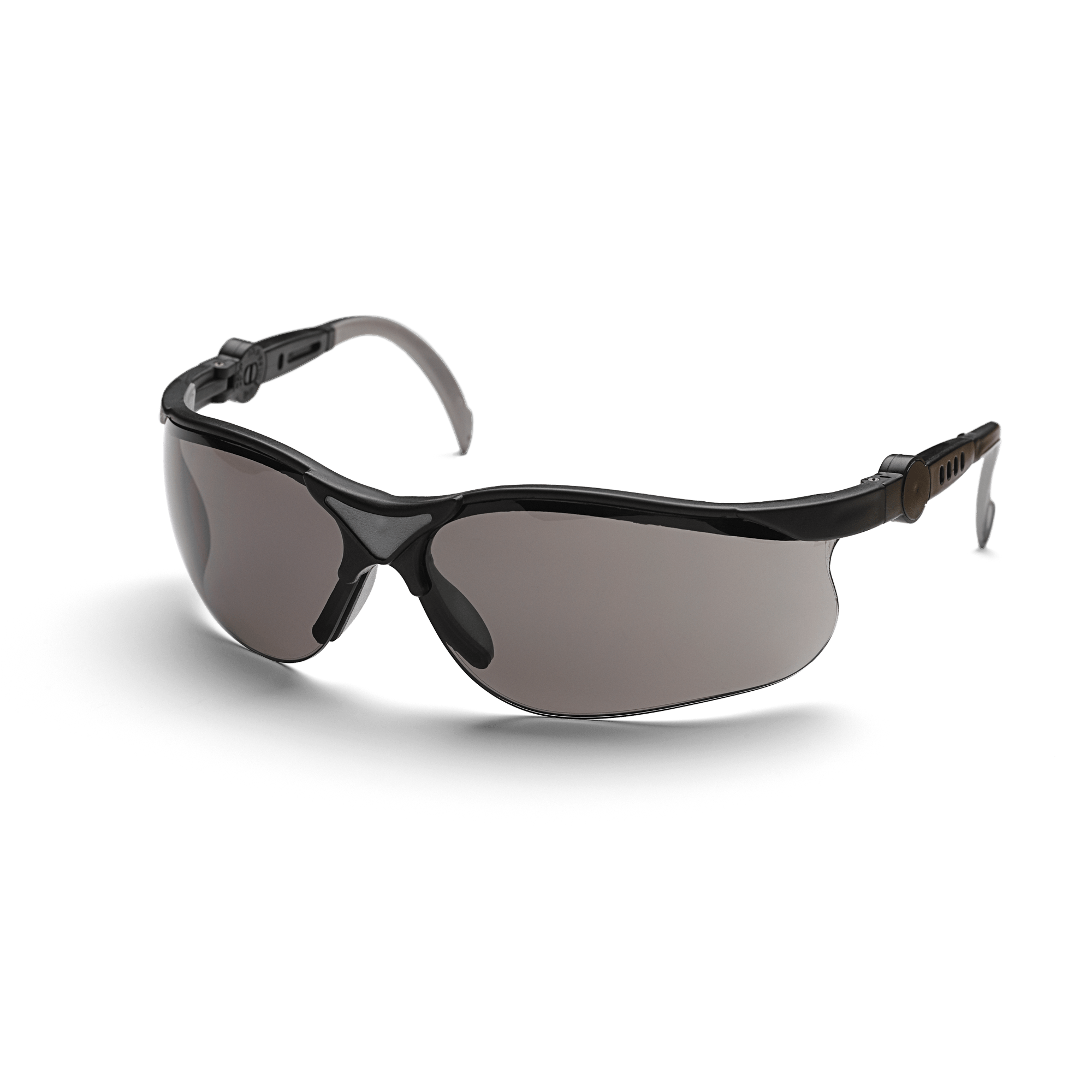 Skyddsglasögon med repfria, mörka linser med UV-skydd för bättre syn i soliga förhållanden. Med bågar som kan förlängas och linser som kan vinklas. Godkända enligt EN 166, ANSI Z87+.